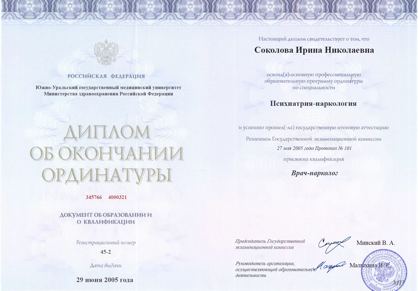 Ирина Николаевна Соколова — высококвалифицированный врач-нарколог с многолетним опытом работы в области диагностики, лечения и реабилитации пациентов с различными формами зависимостей. Окончила Южно-Уральский государственный медицинский университет в 2003 году по специальности "лечебное дело", а в 2005 году — специализацию по направлению "психиатрия-наркология". Благодаря глубоким знаниям в области наркологии и психотерапии, Ирина Николаевна успешно помогает пациентам вернуться к полноценной жизни.